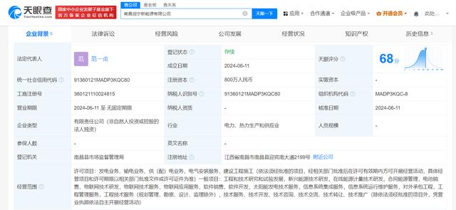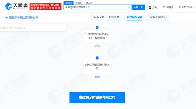 近日,南昌潤寧新能源有限公司成立,法定代表人為范一貞,注冊資本800萬人民幣,經營范圍含工程和技術研究和試驗發展、新興能源技術研發、在線能源計量技術研發、合同能源管理、電池銷售等。股權全景穿透圖顯示,該公司由時代綠色能源有限公司全資持股,后者為寧德時代(300750)全資子公司。
