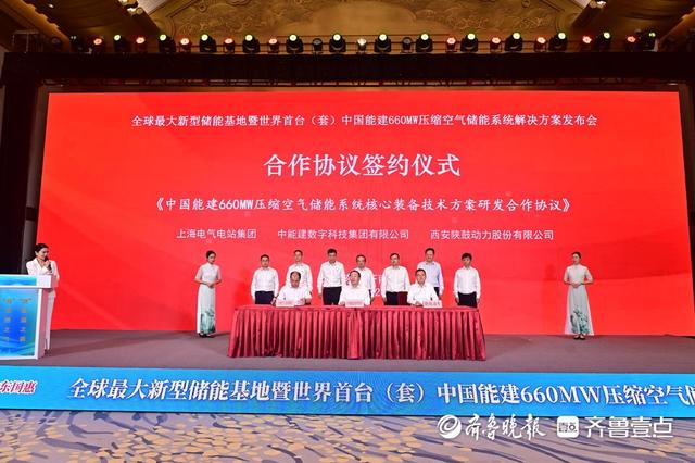 會上,中國能建數科集團發布《世界首臺(套)中國能建660MW壓縮空氣儲能系統解決方案》,并介紹了中國能建在山東省建設3060MW儲能基地的規劃布局及賦能“西電東送”新圖景。山東國惠投資控股集團有限公司、中國石油集團渤海鉆探工程有限公司、陜西鼓風機(集團)有限公司、上海電氣電站集團等項目合作企業,與中國能建數科集團共同簽訂了《中國能建660MW壓縮空氣儲能系統核心裝備技術方案研發合作協議》等三項合作協議,標志著圍繞壓縮空氣儲能的又一“政企合作、央地共建”典范項目正式吹響集結號。