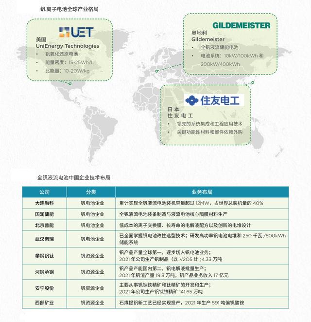 2022 年全釩液流電池整個行業還處于商業化進程緩慢階段,全球范圍內只有日本住友電工、美國 UniEnergyTechnologies、奧地利 Gildemeister 和中國大連融科能提供成熟的商業化產品。2023年,隨著我國在長時儲能、價格補償、鼓勵釩資源開發等支持政策的落地生效以及資本市場的追捧,全釩液流電池賽道創新企業涌現,推動我國全釩液流儲能技術和產業發展向世界領先水平邁進。