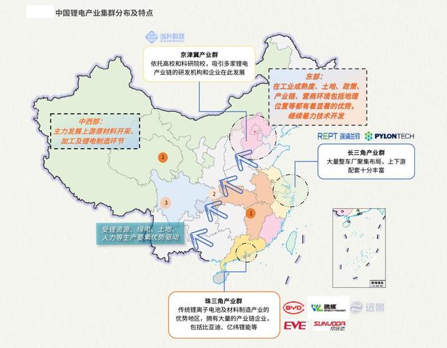 憑借完善的產業鏈配套、科教創新資源等優勢,鋰電產業鏈在長三角、珠三角、京津冀等東部地區逐漸形成產業集群,一批產業鏈龍頭及創新企業在集群土壤中孕育壯大。近年來,由于電力、人力及原材料等價格的上漲,鋰電產業逐漸開始向青海、宜賓、遂寧、重慶等中西部地區轉移。未來中西部地區將依托鋰資源優勢和生產要素成本優勢完善上游原材料開采、加工及鋰電制造環節,而東部地區則憑借其發達的工業基礎,著力發展鋰電研發等技術創新領域。鋰電產業的梯度化專業分工將愈加明顯。