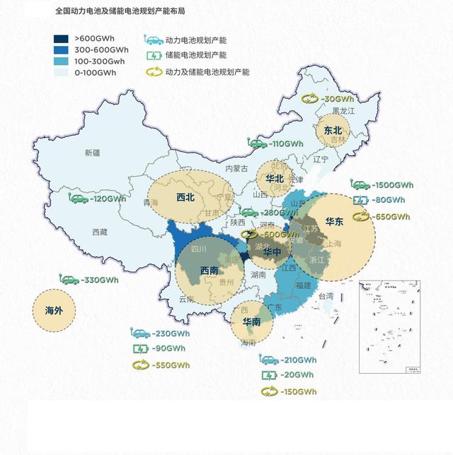 區域布局方面,華東區域產能規劃動力和儲能電池超 2300GWh,集中全國近 50% 產能,華中和西北地區 分別為 850 和 860GWh,華南地區約 380GWh,海外約330GWh。其中純儲能電池產能主要分布在華東和西南地區.