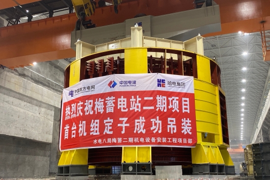 11月8日,梅蓄電站二期項目首臺(5號)機組定子吊裝完成,為2025年首臺機投產發電奠定了堅實基礎。