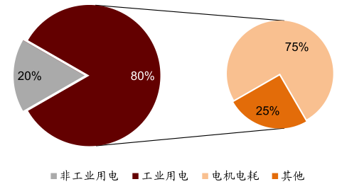 從我國目前全社會用電結構中來看,工商業用戶耗電量約占 80%,其中電機耗電為用電終端中占比最大的部分,約占工業用電的 75%,全國總耗電的 60%;而我國目前中小型三相異步電機中仍以能效等級 3 及以下電機為主,1 及 2 級電機總共僅占約 9%,對于 2 級以下的電機,未來仍有進一步節能改造的能效提升需求空間。