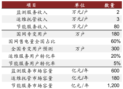 參考電力云平臺運營商新聯電子的電力監測服務數據,為專變用戶提供的電力監測及運維托管服務均以年度收費 2 萬/戶及 3 萬/戶計算,若為全國約 300 戶專變用戶均提供電力監測服務,同時假設對運維托管服務付費的用戶約占總體的 20%,將實現分別為約 600 億、180 億的年度市場。