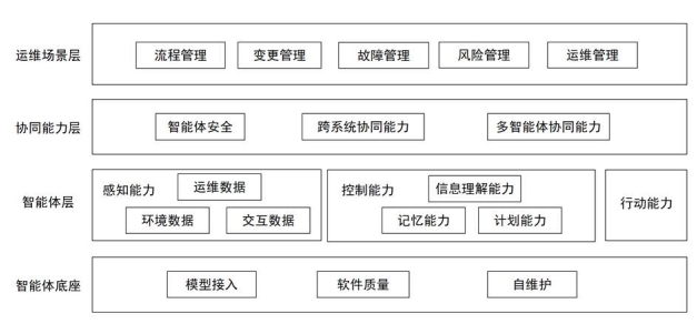 該架構以?場景需求為牽引??,通過協同層打通系統壁壘,以智能體層的感知-決策-行動閉環為核心能力載體,最終由底座提供工程化支撐。四層能力環環相扣,既明確了技術能力邊界,又強調實際落地場景的適配性,為企業構建智能運維體系提供清晰的模塊化建設路徑。