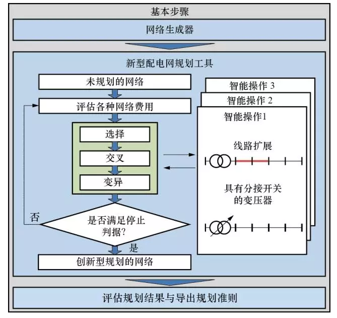文獻(xiàn)[18]針對(duì)中、低壓配網(wǎng)提出一種基于遺傳算法(geneticalgorithm,GA)的規(guī)劃方法,如圖6所示。第一步,根據(jù)不同的供用電要求以及實(shí)際電網(wǎng)特征,生成特征各異的網(wǎng)絡(luò)結(jié)構(gòu);第二步,利用GA方法針對(duì)每種網(wǎng)絡(luò)結(jié)構(gòu)得到最優(yōu)的傳統(tǒng)建設(shè)方案和智能建設(shè)方案;最后,對(duì)所得方案進(jìn)行評(píng)估比較。運(yùn)用GA算法時(shí),每種符合運(yùn)行約束要求的電網(wǎng)配置方案都作為一個(gè)個(gè)體,每次迭代時(shí),以各種網(wǎng)絡(luò)成本(適應(yīng)度函數(shù))最小為目標(biāo),先隨機(jī)挑選兩個(gè)個(gè)體進(jìn)行交叉生成新個(gè)體,然后以減小成本為原則修改個(gè)體(變異),變異后計(jì)算潮流以驗(yàn)證網(wǎng)絡(luò)約束是否越限,如果越限,則通過擴(kuò)建線路等措施修改個(gè)體,或回退到變異之前的初始狀態(tài);此過程不斷繼續(xù),直到滿足收斂判據(jù)。另外,該方法還采用了所謂智能操作(smartoperator)來改善GA求解效率不高的缺陷,即利用一些有效措施(如中低壓變壓器分接頭切換和線路擴(kuò)建相結(jié)合)對(duì)當(dāng)前結(jié)果進(jìn)行智能化修正,加速找到最優(yōu)解的過程。