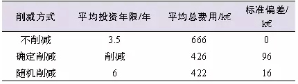 由于規(guī)劃周期較長,考慮了未來峰荷發(fā)展和DG接入容量的變電站規(guī)劃面臨很大的不確定性和投資風(fēng)險(xiǎn),所以必須進(jìn)行風(fēng)險(xiǎn)評(píng)估。文獻(xiàn)[7]在相同功率約束條件下,對(duì)投資變電站和削減配電側(cè)DG發(fā)電出力兩種技術(shù)方案進(jìn)行了比較,給出了優(yōu)化的折中方法。該文獻(xiàn)以30MW變電站接入不同光伏容量(0、1、9.5MW)的情形為例,對(duì)各種削減模式下延緩?fù)顿Y的效果進(jìn)行了比較,結(jié)果如表2所示,與不削減DG容量相比,采用確定(定時(shí))削減方式,投資年限可延緩3.4年,投資費(fèi)用可減少9.6萬歐元;采用隨機(jī)削減方式,投資年限則可延緩2.5年、投資費(fèi)用可減少1.6萬歐元。因?yàn)閷?shí)際參數(shù)的隨機(jī)特性會(huì)影響計(jì)算結(jié)果,所以真正的延緩?fù)顿Y效果主要取決于預(yù)測(cè)模型的精度。
