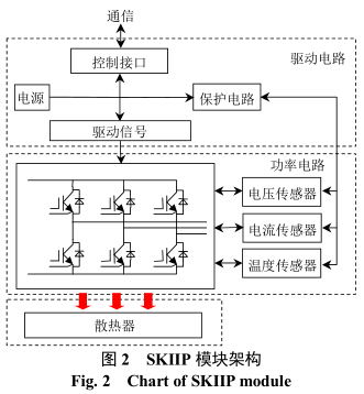 賽米控智能集成功率(Semikron integrated intel-ligent power,SKIIP)模塊[6]集成了功率半導體器件、散熱器以及具有保護和監測電路的門極驅動電路,并具有用于短路和過電流保護的閉環電流傳感器,同時還集成了溫度傳感器。采用SKIIP模塊[6]可以大大簡化逆變器主電路,提高系統的抗干擾能力,該模塊具有標準接口,其架構如圖2所示。