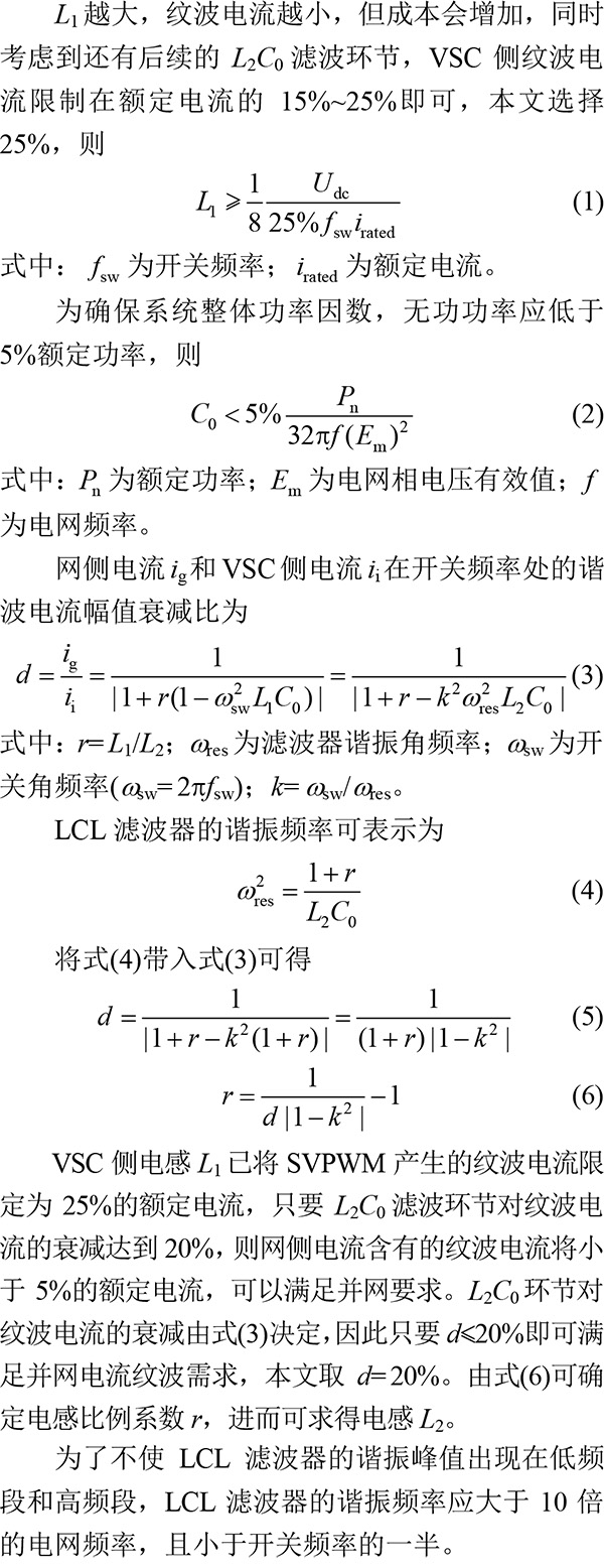 相對于傳統的單電感濾波器,3階LCL濾波器能更好地抑制并網變換器引起的電流諧波。LCL濾波器的參數對系統的動態及穩態性能影響很大,文獻[7]對LCL濾波器參數的限制條件以及設計步驟做了詳細介紹,本文在此基礎上確定LCL濾波器的參數。根據VSC側電流最大允許紋波得到VSC側電感L1的最小值,根據系統的無功功率限定值求得濾波電容C0,最后根據并網電流總諧波得到網側電感L2。