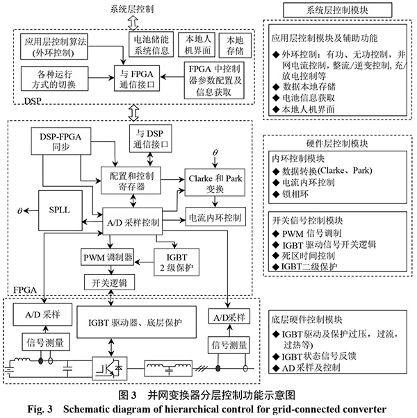 參照通信系統的開放系統互連(open system in-terconnection,OSI)模型,并網變換器分層控制功能示意圖如圖3所示。圖3中:θ為電網電壓相位;SPLL(software phase loop)為軟鎖相環[11];IGBT(insulated gate bipolar transistor)為絕緣柵雙極型晶體管。硬件層控制模塊由FPGA完成;應用層控制模塊由DSP完成算法運算,提高了系統靈活性;系統層控制由上位機完成,可以實現多個儲能系統的大規模調度。層次化的并網變換器接口如圖4所示。
