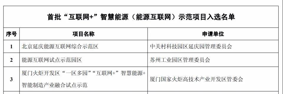 “廈門火炬開發區‘一區多園’‘互聯網+’智慧能源+智能制造產業融合試點示范”項目屬于國家能源局首批“互聯網+”智慧能源(能源互聯網)示范項目之一,項目牽頭單位為廈門國家火炬高技術產業開發區管理委員會,項目于2017年3月6日在國家能源局網站公示。