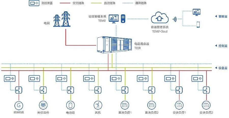 基于電力電子變壓器的交直流混合微網系統總體可分為三層架構。第一層為設備層,主要囊括了分布式電源(風電、光伏系統等)和不同的交直流負荷;第二層控制層,以電力電子變壓器為核心,分布式電源和負荷可通過其靈活的多端口配置實現可靠接入,并通過其中/高壓接口,實現與配電網的有效連接;第三層為管理層,以“雙端”能量管理系統為核心,采用人工智能算法可實現電力電子變壓器交直流混合系統的分布式能源互補優化以及多個端口之間的協調控制,提高能源利用效率,多機并聯系統的集群控制、功率在線優化分配,保障系統效率最優,同時能夠對接電網調度,參與電力市場交易及輔助服務等,真正實現綠色數據中心電能的智能路由。