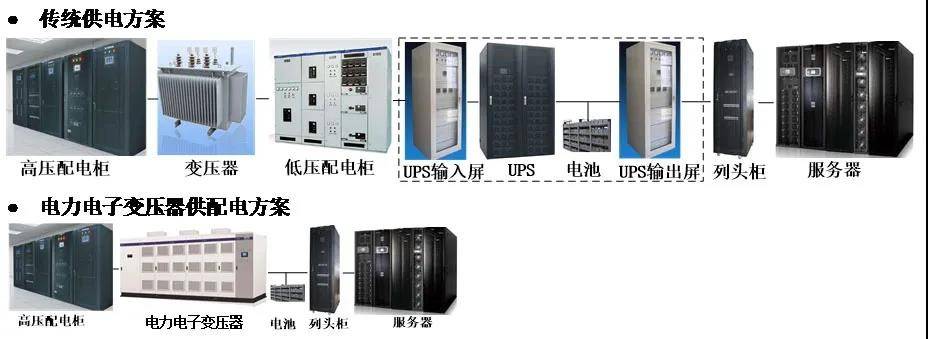 數據中心傳統的UPS供電方案,是由高壓配電柜、變壓器、低壓配電柜、UPS等組成,雖然系統方案成熟,但由于設備種類數量多,電能變換環節多,占地面積大,轉換效率低,已有被逐步淘汰的趨勢。