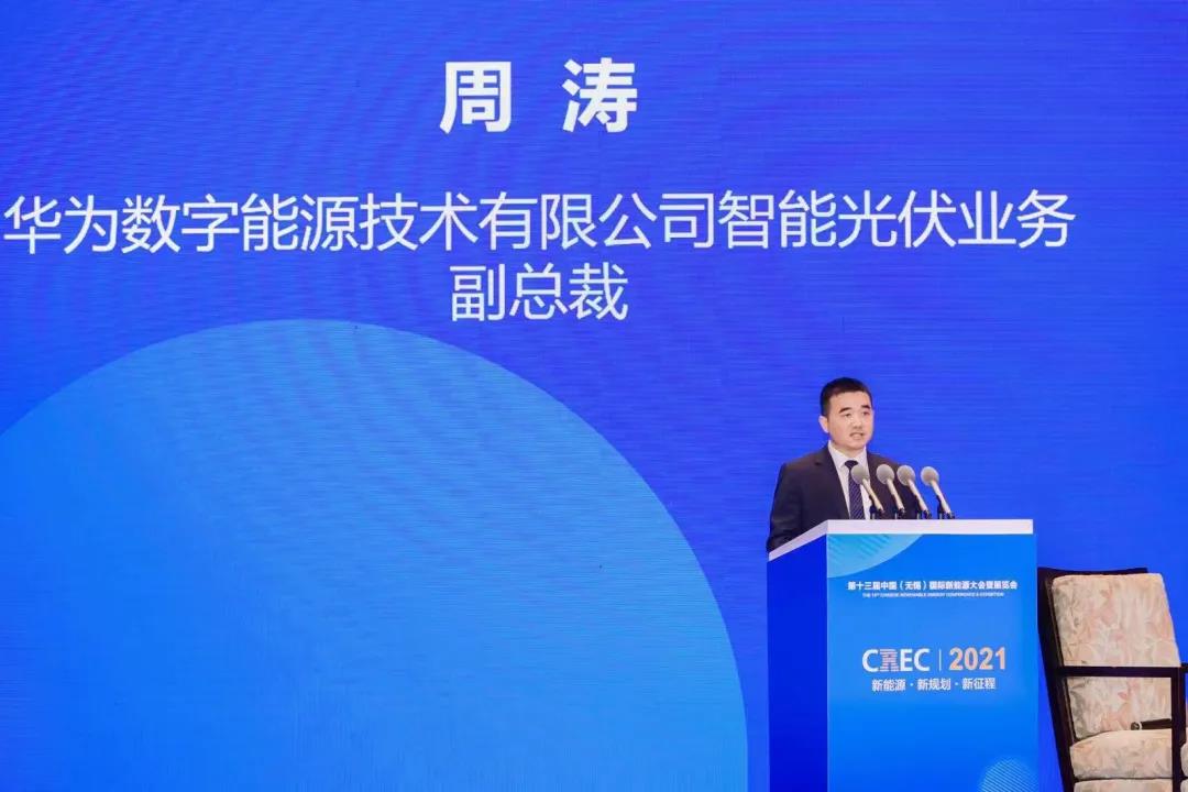 在4日下午本次大會(huì)主論壇“2021全球新能源產(chǎn)業(yè)峰會(huì)”上,華為數(shù)字能源技術(shù)有限公司智能光伏業(yè)務(wù)副總裁周濤帶來了《光儲(chǔ)融合,全面智能 打造面向未來的智能光儲(chǔ)系統(tǒng),助力構(gòu)建新型電力系統(tǒng)》的主題演講。演講以構(gòu)建新能源為主體的新型電力系統(tǒng)出發(fā),圍繞碳達(dá)峰、碳中和能源行業(yè)革命,詳細(xì)介紹了華為數(shù)字能源技術(shù)在改善電網(wǎng)和提高光伏、儲(chǔ)能上的產(chǎn)品和技術(shù)應(yīng)用,展現(xiàn)了華為智能光伏解決方案的創(chuàng)新和引領(lǐng)作用。