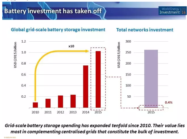 電力儲能投資2015年超過100億美元,過去十年以10%的系數在增長;但是儲能投資僅占電網投資的0.4%。
