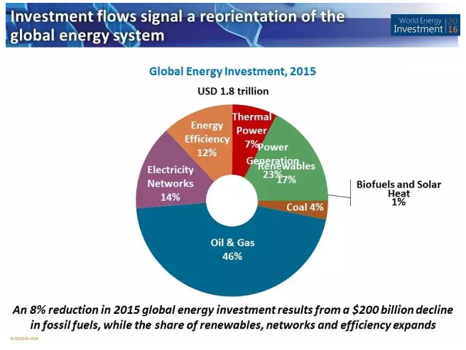 2015年電力行業投資達到了創紀錄的6900億美元,超過能源總投資的37%。可再生能源投資占17%,約占了電力投資的一半。可再生能源投資中,16%來自發電,生物和太陽能只占1%。