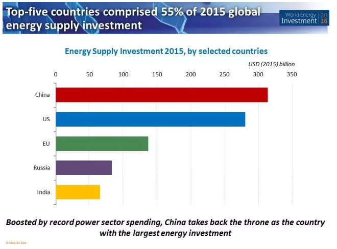 LaszloVARRO介紹,在2015年中國成為全球最大的能源投資國,中國能源領域總投資為3150億美元,占全球能源總投資的17%。主要原因是積極推進低碳能源、智能電網、能效提升等政策。