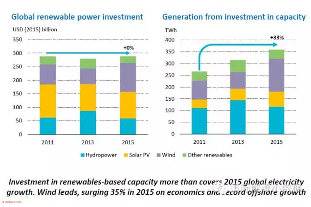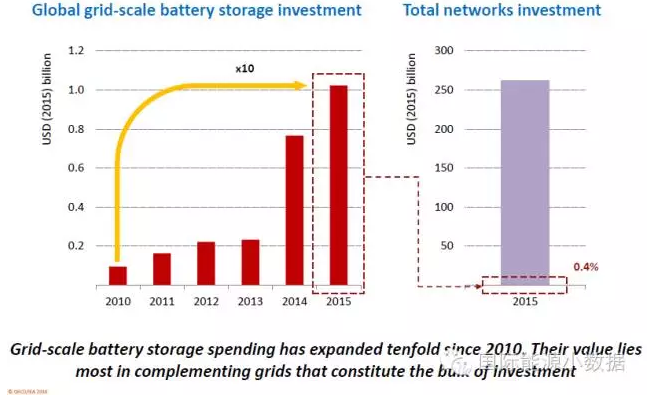 特別值得一提的是,2011年以來全球在可再生能源發電投資基本平穩,但是由于可再生能源成本的下降,每年新增的可再生能源發電量逐年增加,2015年超出2011年33%。此外,電力儲能投資2015年超過100億美元,是2010年的10倍;但是儲能投資僅占電網投資的0.4%,還有很長的路要走。