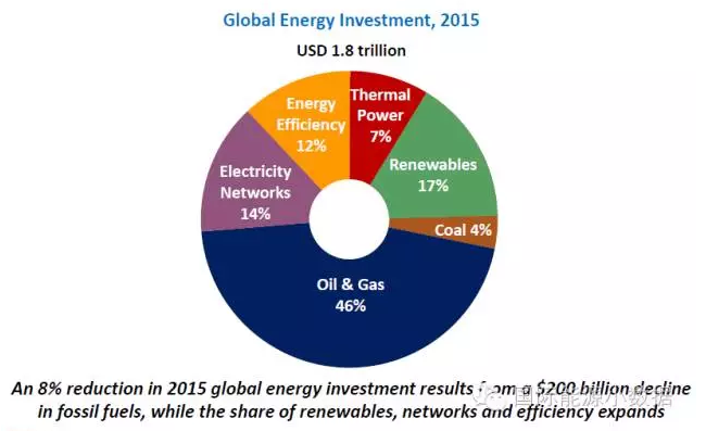 雖說油氣投資大幅下降,但是在全球1.83萬億的能源投資總額中,油氣投資占比達到46%。可再生能源投資占17%;火電發電廠投資占7%,電力輸配網投資占14%;能效投資占12%;煤炭開采和運輸投資僅占4%。