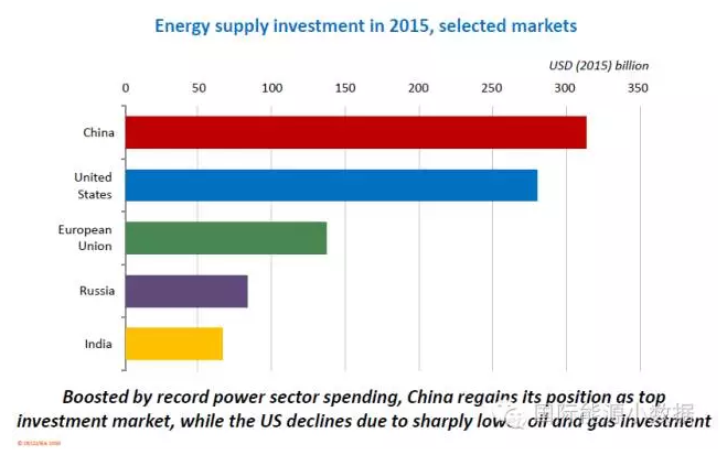 2015年中國能源領域總投資為3150億美元,占全球能源總投資的17%,是世界上第一能源投資大國,遠超位居第二的美國(2800億美元)。在中國能源投資中,有900億美元用于可再生能源發電;450億美元用于化石能源電廠(主要是煤電廠,2015年新增煤電裝機接近45吉瓦)。