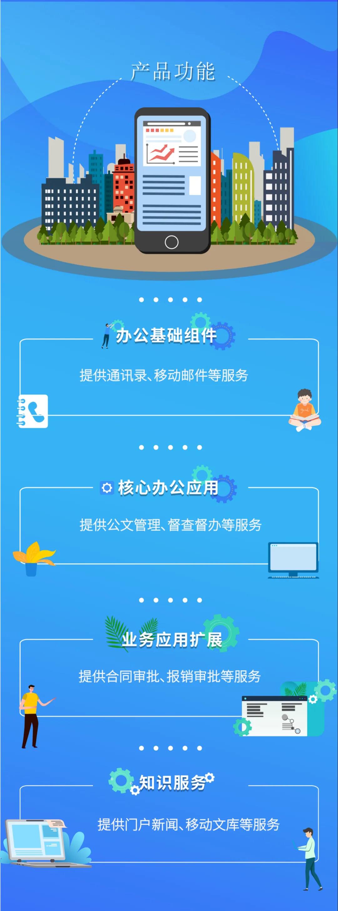 在公文、督辦、會議等核心辦公應用功能的基礎上,實現了即時通訊、移動郵件、文檔協作、視頻會議、知識服務等基礎辦公服務,為用戶提供豐富的移動業務應用功能。