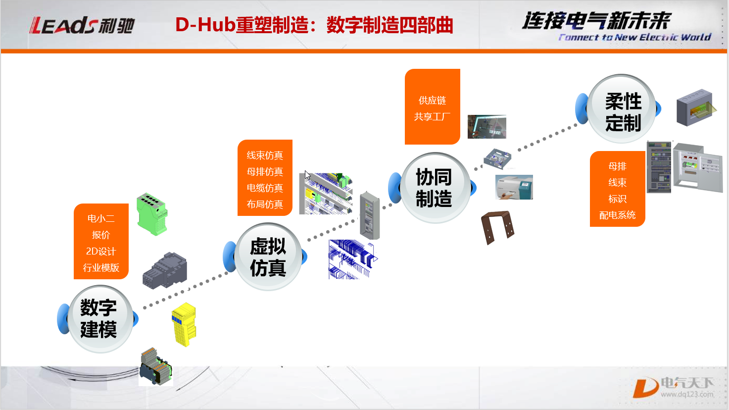 采訪中,令永卓感慨道:“我已經(jīng)服務(wù)于電氣行業(yè)25年,很榮幸作為參與者一路見證電氣行業(yè)由傳統(tǒng)走向今天的智能化,這些離不開智能制造近年來的大力推動。當(dāng)前企業(yè)紛紛將其納入發(fā)展的戰(zhàn)略目標(biāo),利馳也不例外,不斷創(chuàng)新研發(fā),先后推出了工業(yè)電氣一站式工作平臺——電氣天下和D-Hub企業(yè)數(shù)字化協(xié)同平臺,幫助電力裝備制造行業(yè)智造升級。” 據(jù)了解,電氣天下針對個(gè)人用戶開放服務(wù),提供海量免費(fèi)工業(yè)設(shè)計(jì)軟件、選型數(shù)據(jù)及服務(wù)、專業(yè)文獻(xiàn)等資源,幫助電氣行業(yè)上下游實(shí)現(xiàn)電氣的選型、圖紙、樣本資料、軟件下載,涵蓋電氣指數(shù)、電氣智庫知識分享一體化與一站式的服務(wù)。而把眾多工業(yè)軟件集成到一個(gè)云端數(shù)據(jù)庫,一個(gè)統(tǒng)一的數(shù)字化協(xié)同平臺——D-Hub,則成功地打通了選型、報(bào)價(jià)、設(shè)計(jì)、工藝、制造、供應(yīng)鏈的數(shù)據(jù),使得企業(yè)的數(shù)據(jù)資產(chǎn)可以跨部門、跨企業(yè)的共享和復(fù)用,并讓數(shù)據(jù)在流動中不斷增值。目前D-hub已覆蓋多種模板,建立了以3D元件為核心的覆蓋配電、自動化行業(yè)1000多個(gè)品牌、3萬多個(gè)系列、2.5億多個(gè)電氣及自動化元件數(shù)據(jù)庫。令永卓直言:“D-Hub的功能遠(yuǎn)不止此,利馳已經(jīng)在D-Hub上開始發(fā)力,發(fā)展數(shù)據(jù)可視化技術(shù),進(jìn)而實(shí)現(xiàn)設(shè)備互聯(lián)、產(chǎn)線互聯(lián),以及智能調(diào)度,助力電力裝備業(yè)的設(shè)計(jì)、制造的全流程數(shù)字化。并且,未來D-Hub將帶來更多可能性,實(shí)現(xiàn)設(shè)備數(shù)字化,進(jìn)而將設(shè)備資產(chǎn)與維修工程師和設(shè)備生產(chǎn)商連接起來,實(shí)現(xiàn)資源互聯(lián)和設(shè)備在線,最終實(shí)現(xiàn)智能運(yùn)維,更好地服務(wù)電力電氣行業(yè)。”