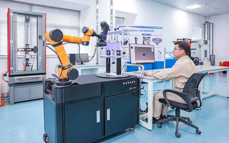 ▲國網江蘇電科院專業(yè)人員在電力物資質量檢測實驗室,開發(fā)適用于絕緣子、金具等物資的高精度激光測量設備