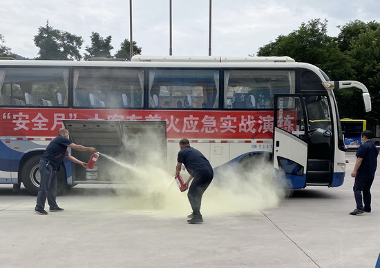 在演練時,隨著滿載乘客的大客車行駛至劉電賓館門前,突然行李艙起火,大客車駕駛員在突然遇火險緊急情況下,立即開啟應急雙閃燈,靠邊停車,打開車門,迅速引導車內乘客有序疏散,并要求大家用濕毛巾捂住口鼻,彎腰依次撤離到車外安全地帶。緊接著滅火組演練人員迅速行動起來,熟練地取出車載滅火器,拔下滅火器安全銷,用噴口對準火源根部,及時將火撲滅,救護組及時疏散和救援下車人員,并對傷員身體狀況進行基本護理和檢查。整個演練過程既緊張,又有條不紊,進一步增強了全體員工的安全意識,真正掌握了交通工具突發火險后迅速逃生、自救、互救的基本方法,達到了演練的預期目的。