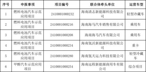 根據《關于開展海南省燃料電池汽車等技術示范應用項目第一批(2023-2024年)申報工作的通知》(瓊工信汽車〔2024〕25號)有關要求,經企業聯合體自愿申報、市縣工信主管部門推薦、專家評審和公示等程序,確定海南清志新能源科技有限公司等為牽頭單位的6個項目入圍海南省第一批(2023-2024年)燃料電池汽車等技術示范應用項目(見下表),現予以公布。對入圍6個項目將采取“賽馬制”方式對優先達到第一階段車輛推廣任務的4個項目納入本批次支持范圍,其他按要求完成的項目遞補至下一批次示范應用項目中,按下一批次獎勵標準執行。