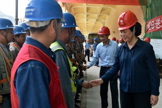 本網訊 6月27日下午,參加甘肅臨夏州電力系統技能大賽暨國網甘肅劉家峽水電廠首屆職工技能運動會閉幕式的臨夏州總工會黨組書記、常務副主席馬梅英以及省電力公司工會副主席李明東等一行,在劉電廠廠長李永清、黨委書記付廷勤及在家廠領導的陪同下,到進廠公路高邊坡防護處理工程現場慰問現場工程人員和農民工兄弟。