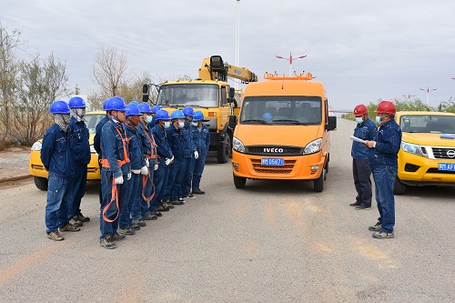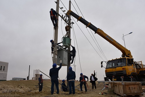 早上7點,全體人員在雅布賴營業所集合并開會,“今天的工作內容為安裝變壓器,大家要注意做好安全措施,前不久剛發生的4·20事故我們要引以為戒,嚴格牢記‘十不干’,杜絕一切違章作業。”馬新民一邊發著新手套一邊提醒道。在10千伏9101中泉子Ⅰ回線管委會支14號桿處,作業人員要進行立桿并安裝低壓綜合配電柜,呼嘯的寒風加大了吊車吊物的難度,也更考驗工作班成員之間的默契,“4人登桿,4人當小工做地勤,1人協調指揮吊車”,負責人武開旋迅速做出工作安排。“巴爺,幫我在小繩上系個瓷瓶”、“偉哥,你那邊高了,再低一點就好了”,“聽我的,一二三,一起用力!”工作班成員各司其職、團結協作,僅用時四個小時,完成了對雅布賴工業園公變的安裝,進一步保證了工業園用電負荷。