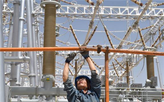 5月27日,工作人員在位于寧夏吳忠市同心縣的妙嶺750千伏變電站施工現場施工。