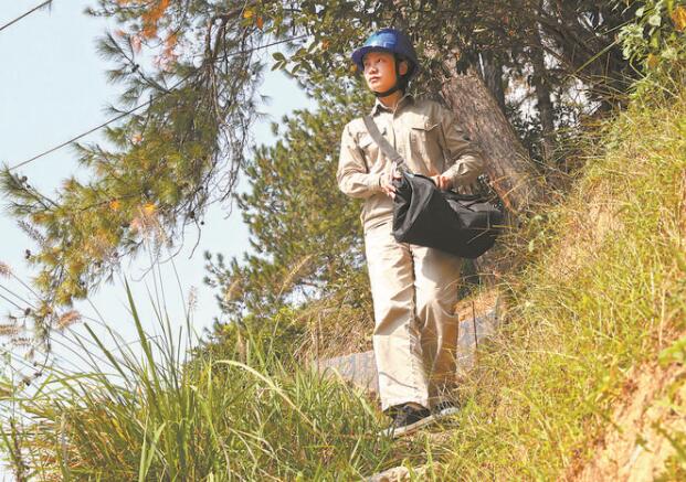 黃麗英負責巡檢的3條10千伏線路總長19千米、0.4千伏線路總長39千米。雖然線路不算長,但這些10千伏線路穿過海拔800多米的大山,線路廊道處于深山中,覆蓋區域生長著茂盛的桉樹。她從一座山再到另一座山要用4小時以上。