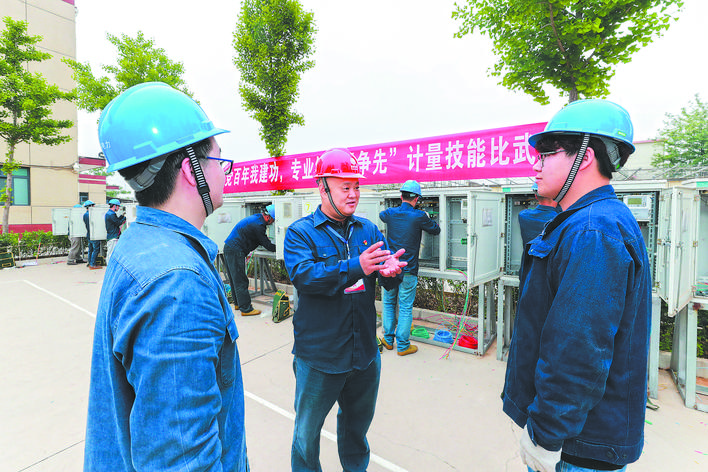 張遠平(左)在計量專業(yè)技能比武活動現(xiàn)場,向選手講解裝表接電技術(shù)要點。黃曉東 攝