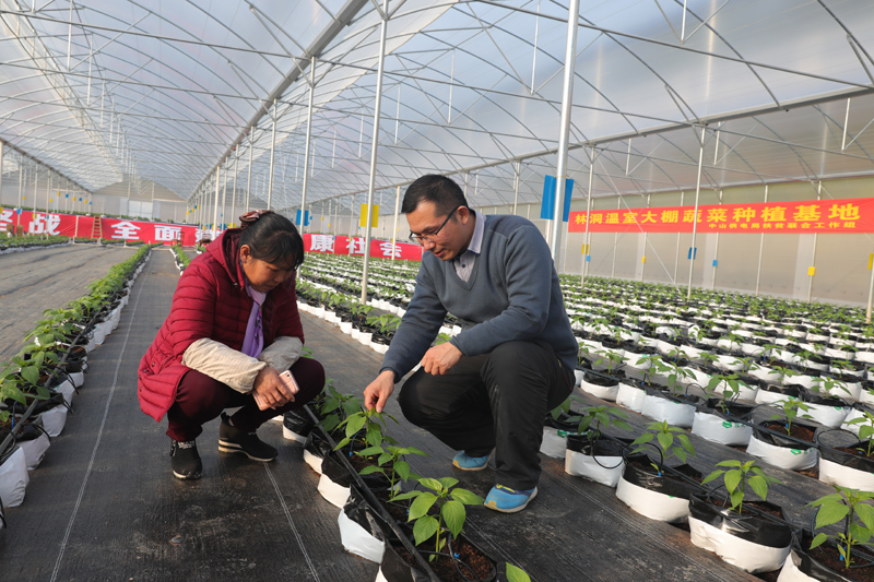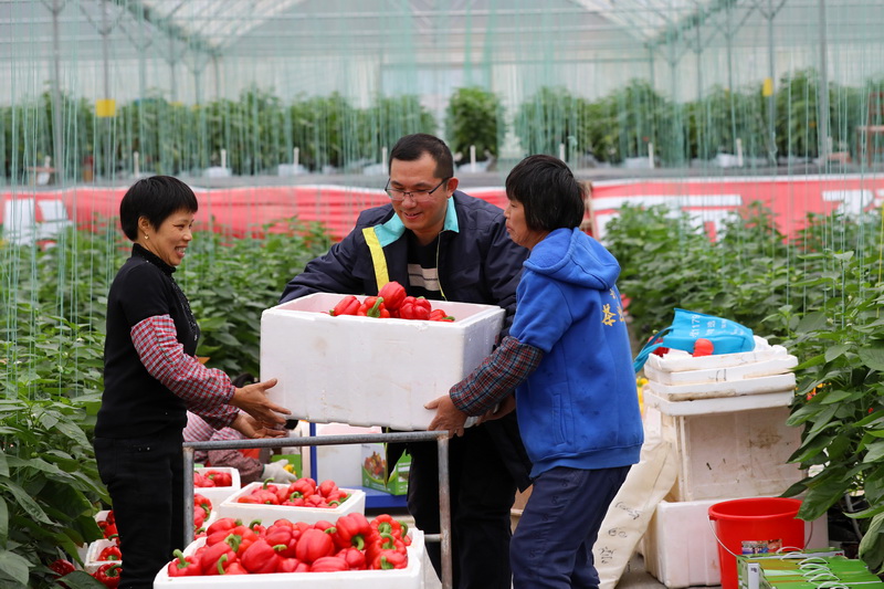 大棚種植基地迎來豐收喜悅,小婷媽媽和高鋒一起搬運豐收的彩椒。孫嘉彪 攝