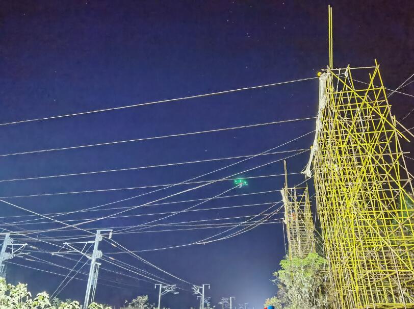 當(dāng)晚0時(shí)0分,六旋翼無人機(jī)從武西高鐵南側(cè)起飛,牽引著迪尼瑪繩向北側(cè)飛去,地面作業(yè)人員順著無人機(jī)的牽拉力量緩緩放繩。鐵路軌道處監(jiān)護(hù)人員密切觀測著各級引繩與跨越架之間的距離,通過對講機(jī)通知牽張場及時(shí)調(diào)整牽張力,確保架線施工順利進(jìn)行。