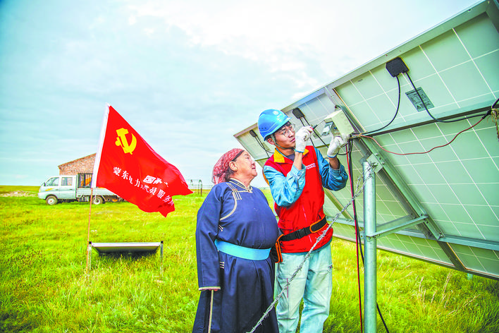 國家電網蒙東電力(呼倫貝爾新巴爾虎右旗)共產黨員服務隊隊員為牧民檢查光伏板。宋天培 攝