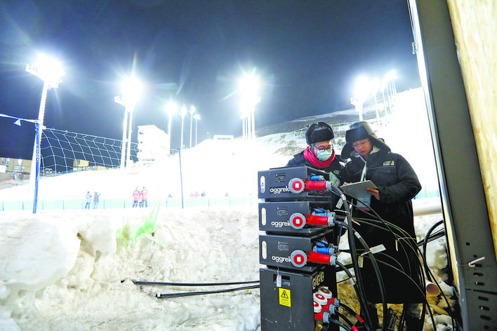 盡管有著嚴格的流程,供電保障團隊還要不時應對各種突發情況。雪上競賽的一大特點是變化多——受氣溫、風力等因素影響,測試活動時間隨時可能改變。原定于19時舉行的雪上技巧測試活動最終因大風推遲,提前兩小時到位的值守人員原地等待,在活動結束后1小時確認保電任務完成,再從賽道撤離。