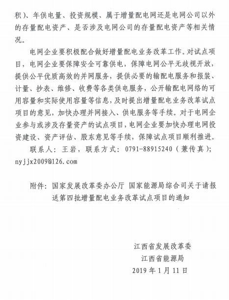 江西省發改委、江西省能源局日前聯合發布了《關于報送第四批增量配電業務改革試點項目的通知》,要求各地要結合工作實際情況,認真總結前三批試點經驗,按照國家相關要求盡快篩選符合條件的第四批試點項目,試點項目應符合省級電網規劃。強調電網企業要積極配合做好增量配電業務改革工作。對試點項目,電網企業要保障安全可靠供電,保障電網公平無歧視開放, 提供公平優質高效的并網服務,提供必要的輸配電服務和報裝、 計量、抄表、維修、收費等各類供電服務,公開輸配電網絡的可 用容量和實際使用容量等信息,及時提出增量配電業務改革試點項目的意見,加快辦理并網接入、供電服務等手續。
