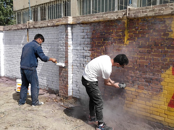 烈日當頭,33℃的高溫絲毫沒有影響到大家干活的熱情。修繕路基的男生們和著水泥、手拿磚塊堆砌出一條筆直的長線;清理墻面的男生也不甘示弱拿著鋼絲刷,拎著裝滿油漆的白桶、滾筒刷來到圍墻外清理墻面;打掃庭院的女孩們拿著手中的勞動工具攀高爬下、忙忙碌碌。到了午休時分,為保質保量完成任務,張志龍,作為墻面清理負責人的他,選擇獨自留下,汗水一遍又一遍打濕他身穿的工作服,各色的粉塵混合著白色的油漆落在他的身上。他說:“今天雖然很累很辛苦,但看到俺們自己的勞動成果,能給大家創造好的環境,我覺得很有意義”。言辭之間,他充滿著自豪和快樂。直到晚上快十點,完成門口的墻面粉刷任務,幾個人才帶著一身的泥土回家吃飯。