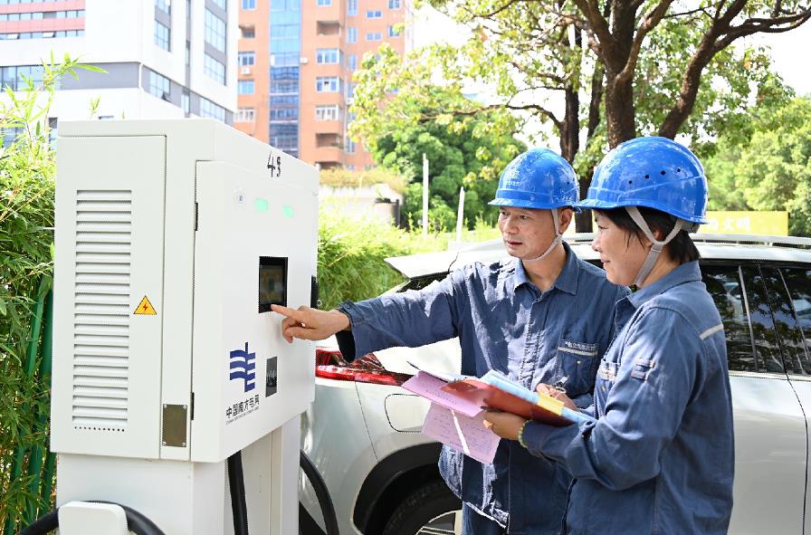 南方電網廣東佛山南海供電局工作人員正在檢查驗收充電樁設備