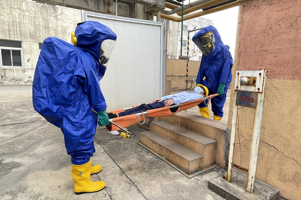 此次演練模擬液氨儲(chǔ)罐出口母管至3號(hào)液氨蒸發(fā)器一次門(mén)前法蘭漏氨,造成氨站現(xiàn)場(chǎng)氨濃度高,人員在現(xiàn)場(chǎng)暈倒。事故開(kāi)始后,集控室發(fā)出報(bào)警,氨站雨淋閥自動(dòng)噴淋裝置自動(dòng)開(kāi)啟,迅速啟動(dòng)液氨泄露現(xiàn)場(chǎng)應(yīng)急響應(yīng),值長(zhǎng)下達(dá)營(yíng)救受傷人員的命令,運(yùn)行人員穿戴防護(hù)服、防毒面具及正壓式呼吸器,對(duì)事故現(xiàn)場(chǎng)人員轉(zhuǎn)移搶救、漏點(diǎn)查找、漏點(diǎn)隔離、管道氨置換及漏點(diǎn)處理等操作,消防車(chē)到達(dá)現(xiàn)場(chǎng),消防人員全程對(duì)漏點(diǎn)進(jìn)行消防水噴射,協(xié)助現(xiàn)場(chǎng)漏氨處理,保安人員在現(xiàn)場(chǎng)進(jìn)行隔離和安保警戒。整場(chǎng)演練,參演人員各司其職、密切配合,事故處理及時(shí)準(zhǔn)確,氨區(qū)設(shè)備正常運(yùn)行,隱患排除。