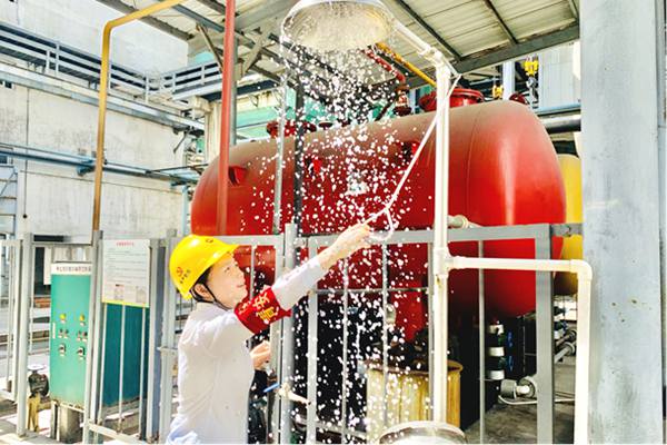 圖為該公司青年員工正在進行酸堿罐區域應急設施可靠性檢查