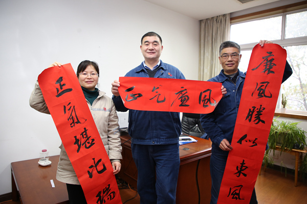寧柏偉給該公司總經(jīng)部、財(cái)務(wù)部、燃運(yùn)部、思政部、前期辦以及法律(風(fēng)控)事務(wù)部等部門(mén)贈(zèng)送了廉潔春聯(lián)。每到一處,寧柏偉親自將春聯(lián)送到各部門(mén)負(fù)責(zé)人手中,并合影留念表達(dá)新年祝福。他談到,此次送廉政春聯(lián)活動(dòng),該公司紀(jì)委首次將范圍擴(kuò)大到全體部門(mén),通過(guò)開(kāi)展為部門(mén)送廉政春聯(lián)活動(dòng),寓教于樂(lè),宣傳廉政紀(jì)律,提醒領(lǐng)導(dǎo)干部員工時(shí)刻繃緊廉潔自律線,清廉、祥和過(guò)春節(jié);同時(shí)將廉政文化元素融入春聯(lián)之中,展示了中國(guó)傳統(tǒng)文化,以喜慶的形式弘揚(yáng)清風(fēng)正氣,傳遞廉潔正能量。