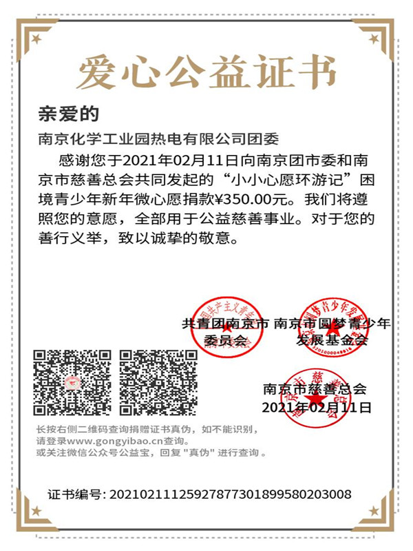 經過前期的調研了解,南京市仍有很多青少年處于困境,他們在新的一年也有屬于自己的小夢想、小心愿,在南京市團市委、南京市民政局、南京市希望工程辦公室的牽頭主辦下,“2020-2021年暖冬行動暨小小心愿環游記”已拉開帷幕。公司團委創新工作方法,用義賣取代傳統的捐款,讓大家在收獲新春喜悅的同時,也能給需要幫助的人傳遞溫暖,福氣加倍。