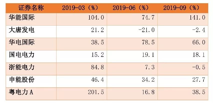 2019 年前三季度華能國際(5.700, 0.03, 0.53%)、華電國際(3.650, 0.01, 0.27%)、國電電力(2.290, -0.01, -0.43%)、大唐發電(2.420, 0.00, 0.00%)收入增速在0-10%,凈利潤除大唐發電之外前三季度均保持較高增長。收入增速的變化主要是受到電價同比提升和發電量增速回升的影響。