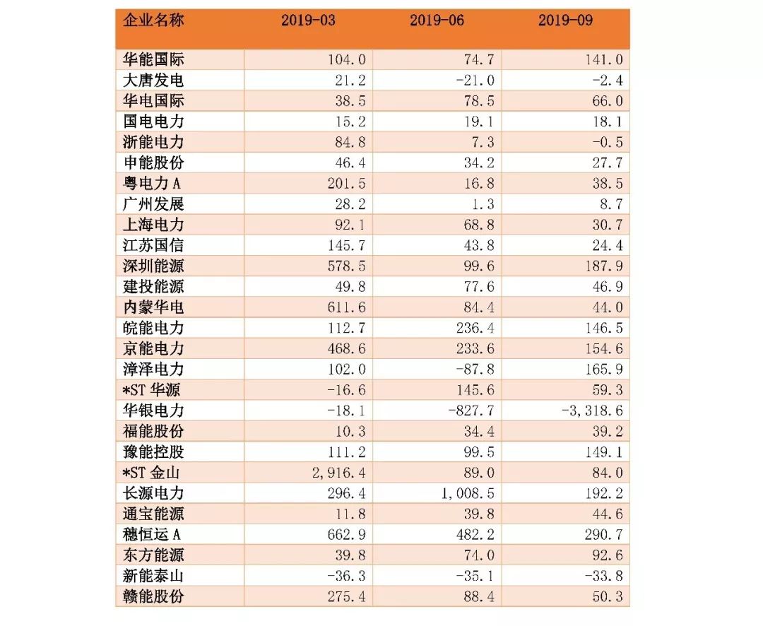 2019年三季度,電力行業74家上市公司中,實現歸母凈利潤同比正向增長的有31家,有3家(分別為:漳澤電力(2.380, 0.00, 0.00%)、*ST凱迪(1.050, 0.00, 0.00%)(維權)、太陽能(3.380, -0.01, -0.29%))公司扭虧為盈。