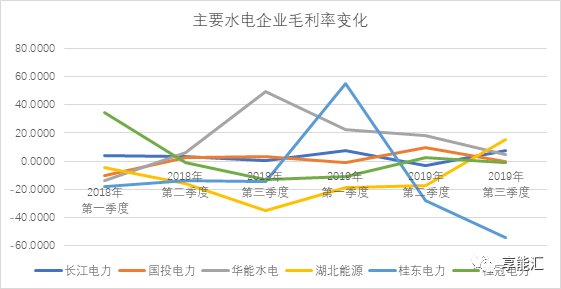 2019年前三季度水電公司長江電力(18.010, 0.01, 0.06%)發電量增速為-2%、華能水電(4.360, 0.02, 0.46%)發電量增速為36%、桂冠電力(4.600, 0.01, 0.22%)發電量增速為-2%、國投電力(8.660, 0.04, 0.46%)發電量增長為8%。受季節水量變化影響,長江電力、華能水電、國投電力發電量增速均較前一季度有所下滑。受水量的影響,可以看到前幾大企業毛利率同比變化明顯。
