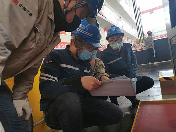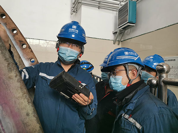張博(左一)為青年職工講解轉輪支架縫隙測試儀使用方法