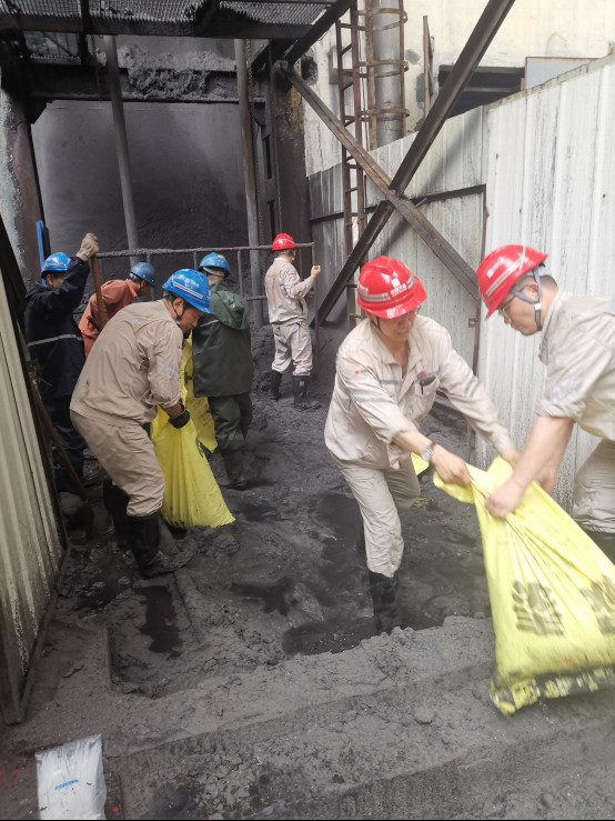 上午10時(shí),暴雨加劇,主機(jī)集控室開始大量漏水,吊頂部分塌落,下方的電子設(shè)備間漏水嚴(yán)重,部分參數(shù)失真;汽機(jī)房外的廠內(nèi)主路積水達(dá)50公分;煤溝進(jìn)水;廠前區(qū)全部停電、大門外波濤洶涌;墻外從山上下來的山洪更是濁浪排空。危急關(guān)頭,首陽山項(xiàng)目部20余名黨員干部職工積極參與防汛行動(dòng),用沙袋堵塞缺口,加固堤壩,險(xiǎn)情逐漸消除。17時(shí),首陽山發(fā)電公司運(yùn)煤通道路基塌方,燃煤運(yùn)輸中斷。險(xiǎn)情就是命令!面對只有兩天用量的煤炭庫存,項(xiàng)目部人員積極參與到首陽山發(fā)電公司抗洪搶險(xiǎn)隊(duì)伍中,共筑防汛抗洪“同心堤”。經(jīng)過連續(xù)八個(gè)小時(shí)團(tuán)結(jié)奮戰(zhàn),燃煤供應(yīng)線路逐步恢復(fù),大唐人抵抗住了偃師幾十年罕見的暴雨襲擊,為地方抗洪搶險(xiǎn)、保障城市安全電力貢獻(xiàn)了力量。